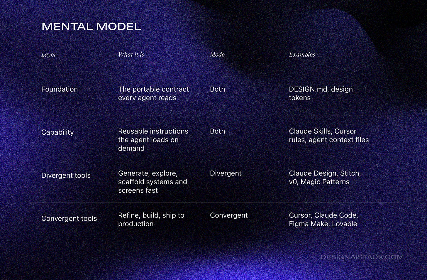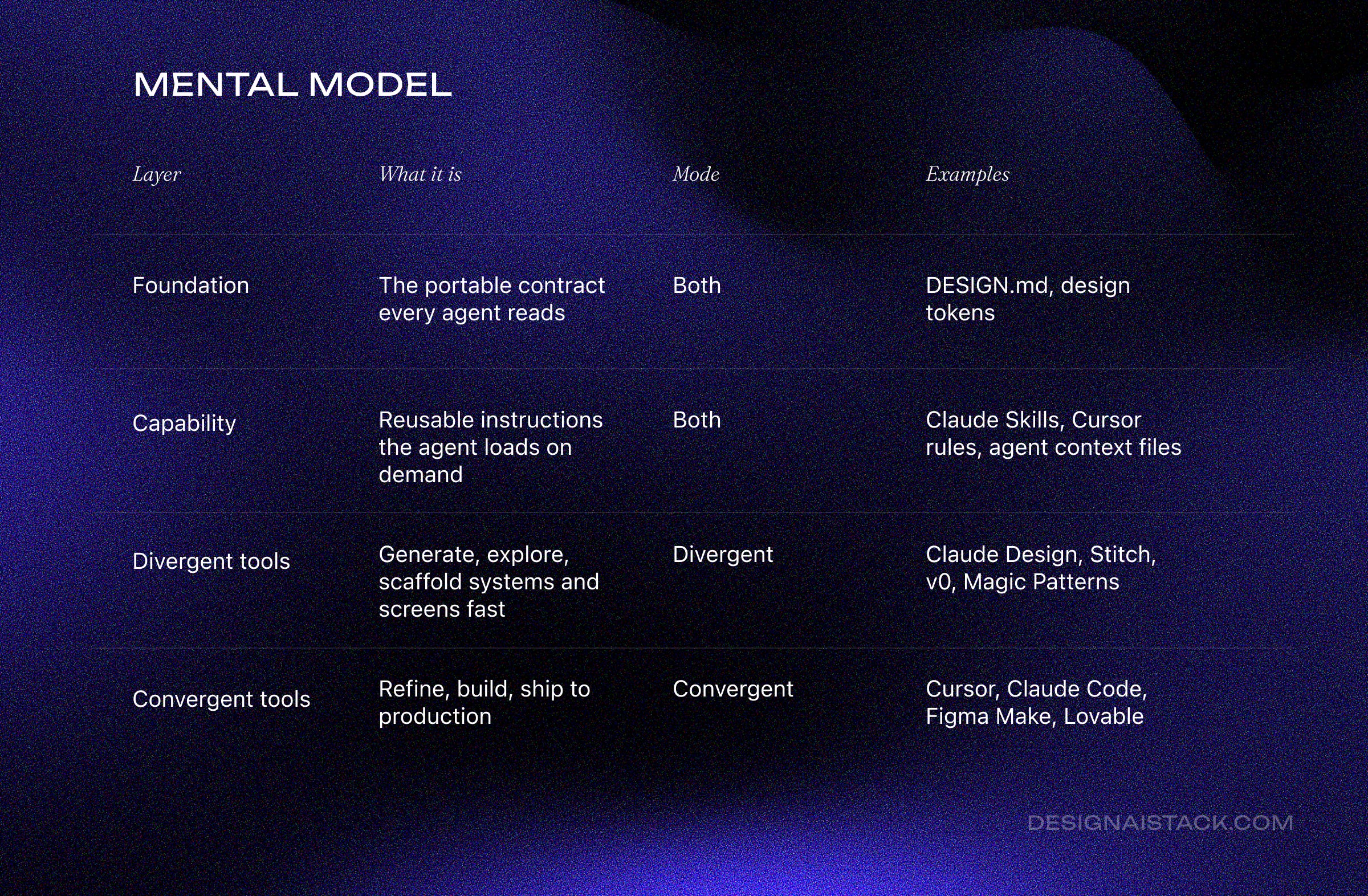 Divergent tools generate ideas. Convergent tools ship them. Capability layers tell the agent how to behave. The foundation is what every layer reads to stay on-brand.